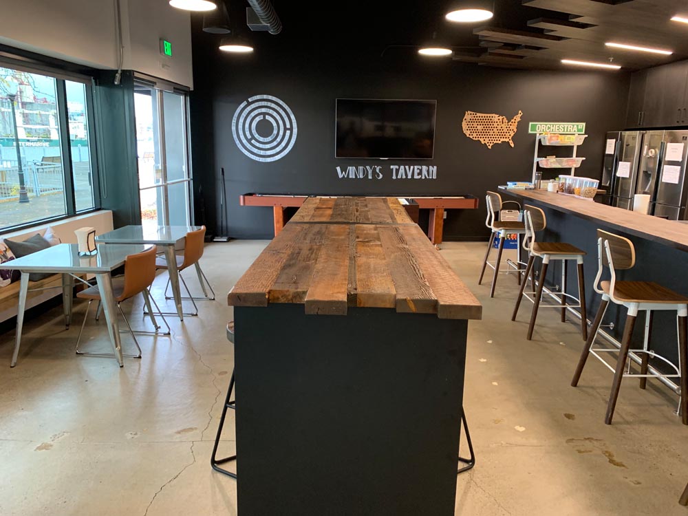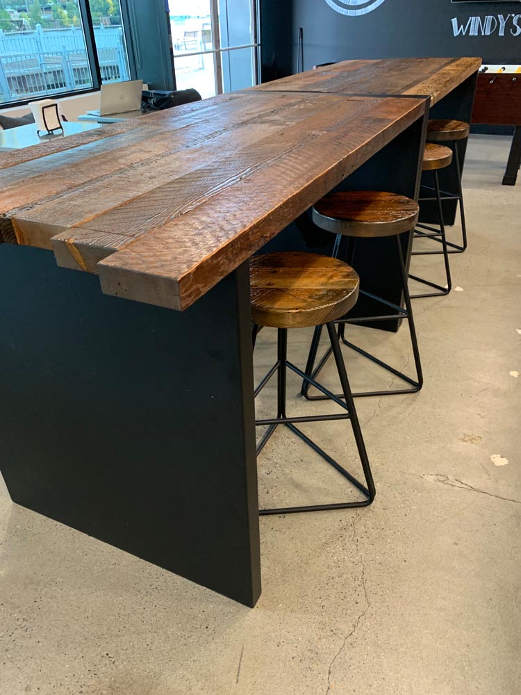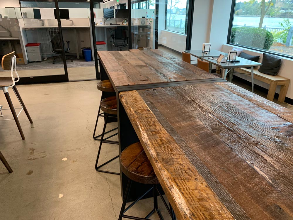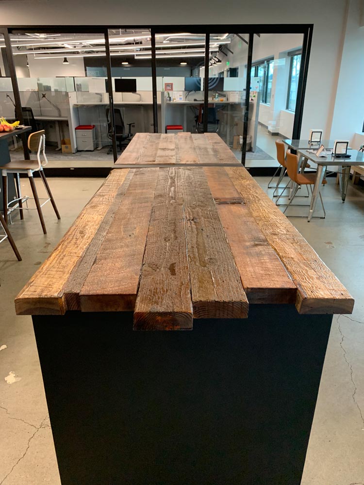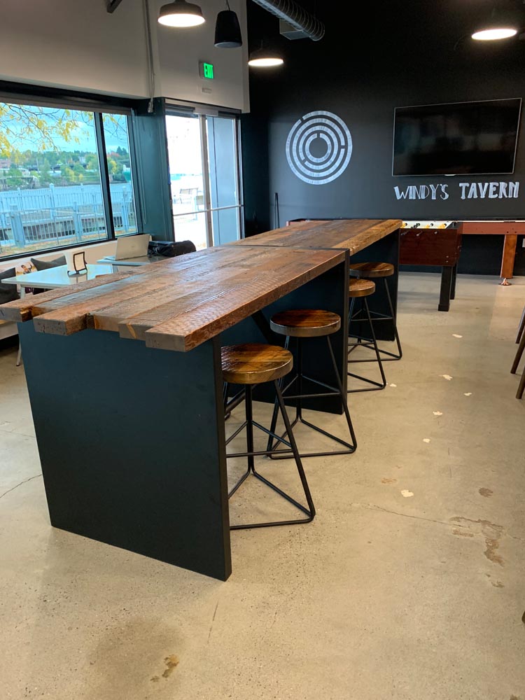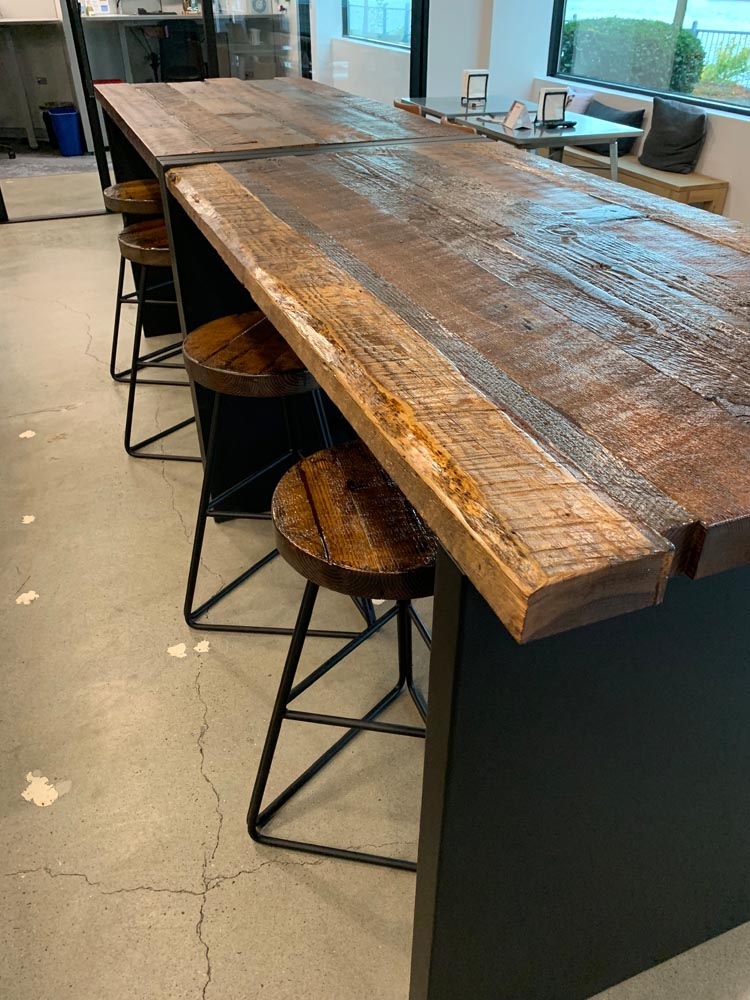 Orchestra’s commitment to sustainability extended to their request for custom bar tables and stools. PDXOriginals designed these pieces using reclaimed wood dating back to 19th-century Portland, giving new life to local history. The waterfall table design, inspired by the city’s natural water features, serves as both an attractive centerpiece and a functional gathering space. By integrating unique, locally sourced materials, we demonstrated how our custom and contract furniture solutions can be tailored to reflect a company’s values while meeting diverse workspace needs.