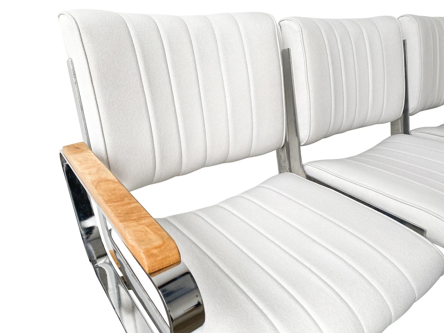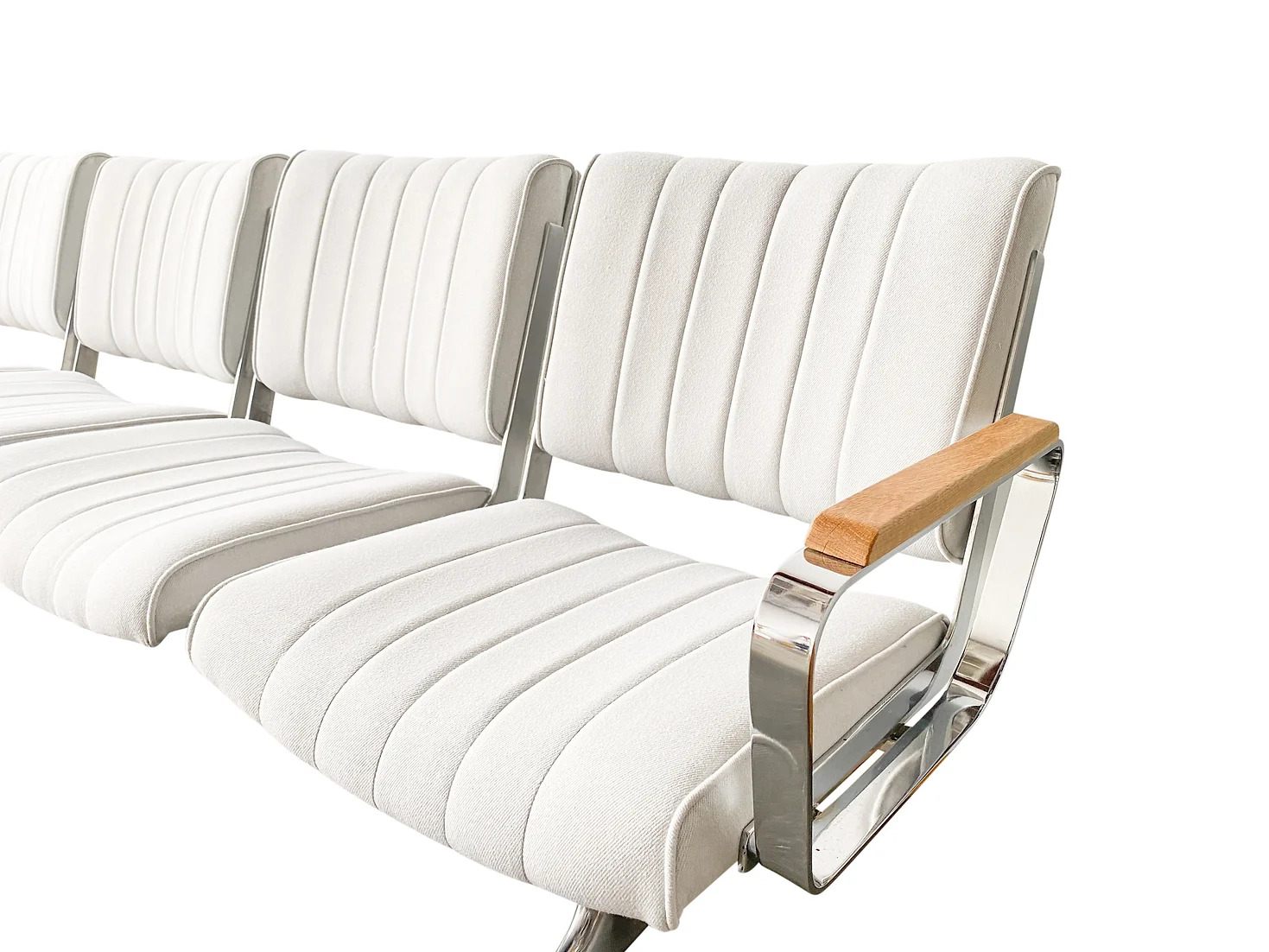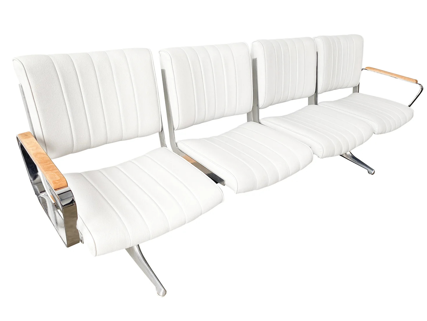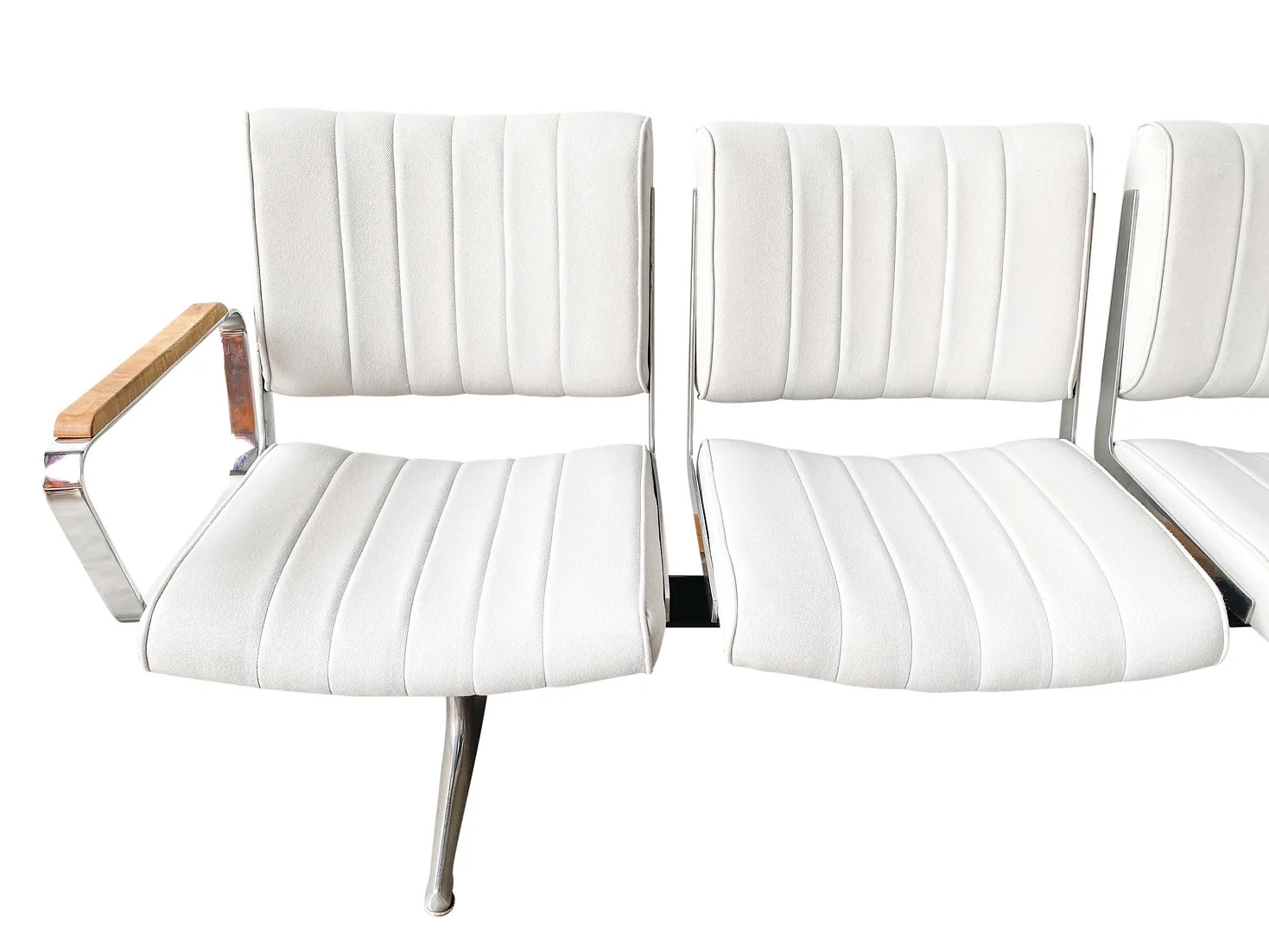 Originally crafted by Chromcraft and installed in Portland International Airport in the early 1980s, these benches reflect exceptional craftsmanship and durability. Our meticulous refurbishment process preserves their character, with polished metal accents and thoroughly cleaned seats. Minor nicks and wear from years of use serve as a testament to their enduring quality and unique history.